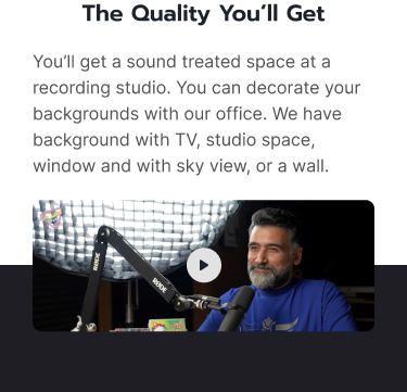 You’ll get a sound treated space at a recording studio. You can decorate your backgrounds with our office. We have background with TV, studio space, window and with sky view, or a wall.